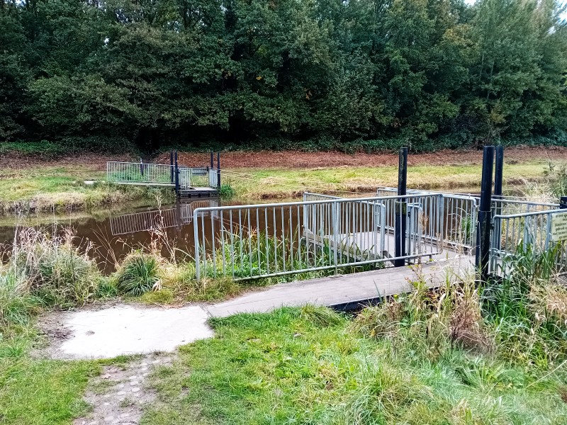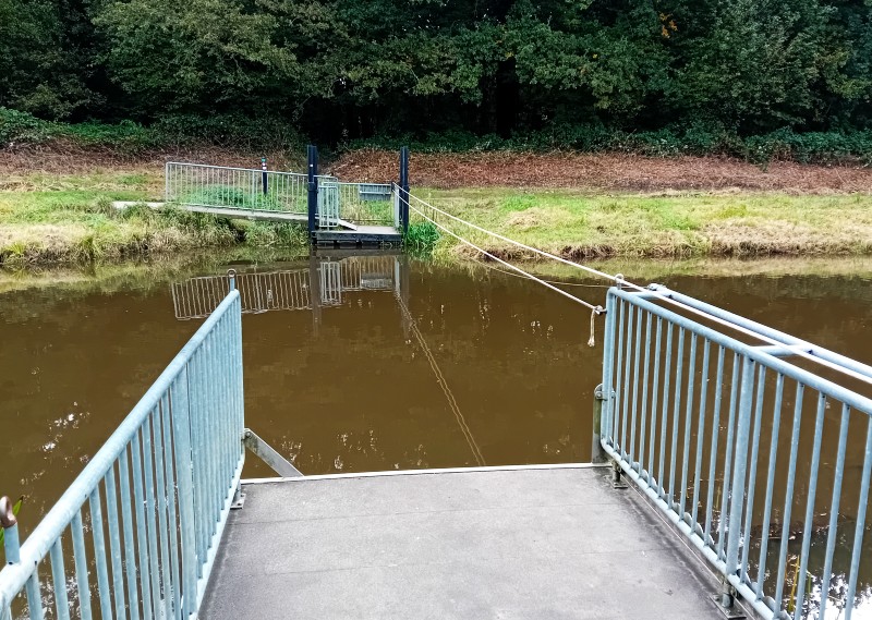 Enkele passagiers steken over. Maximaal 6 personen. Links zien we de speciale constructie om fluctuaties in de waterhoogte van de rivier te kunnen volgen. Datum: 2024.10.12 Auteur: Wim Kusee