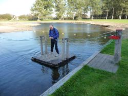 In Landal park Suyderoogh (bij het Lauwersmeer) ligt er een klein speelpontje om daarmee naar een klein eilandje over te varen.